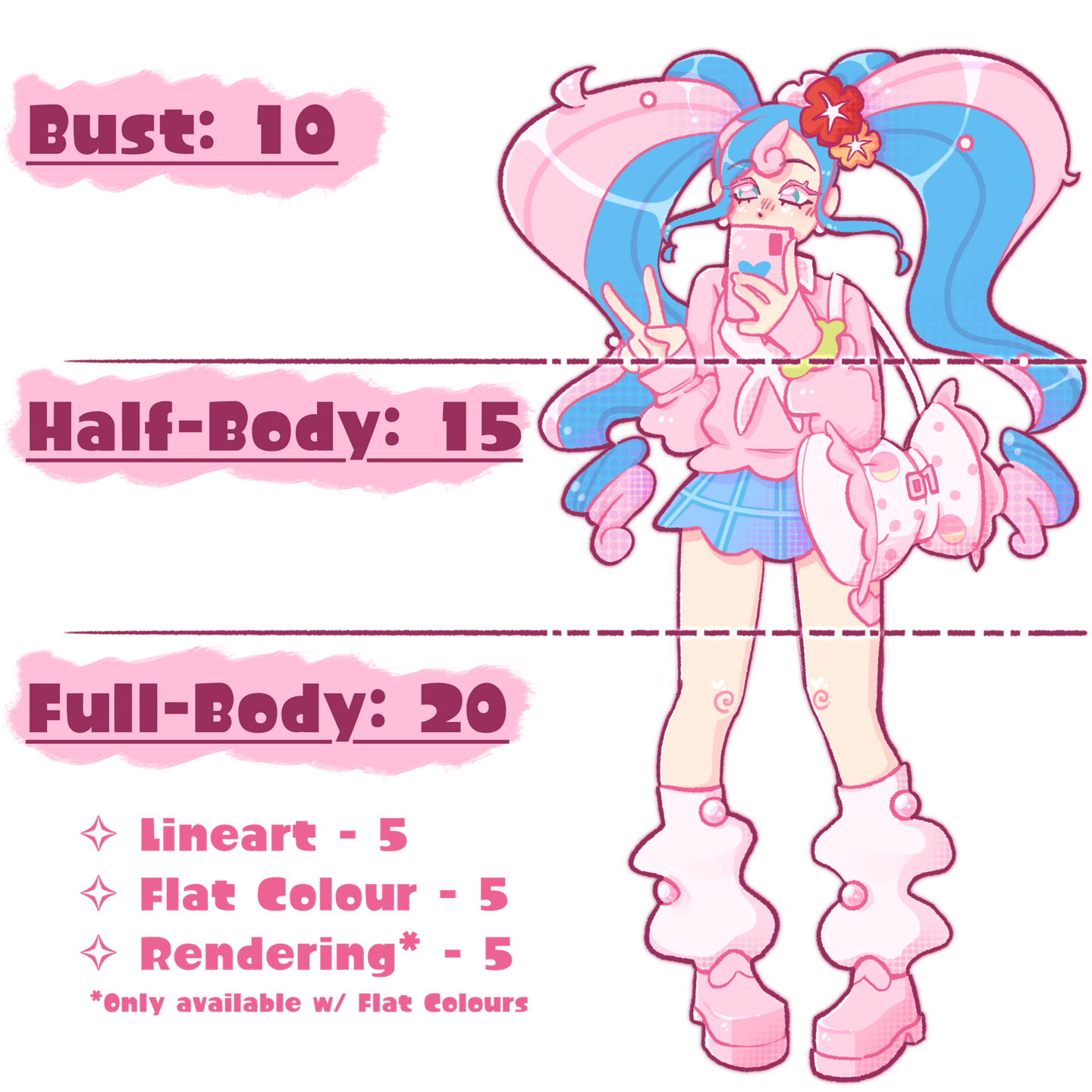 Lineart, Colour, Rendering, and Simple Backgrounds are +$5 per option